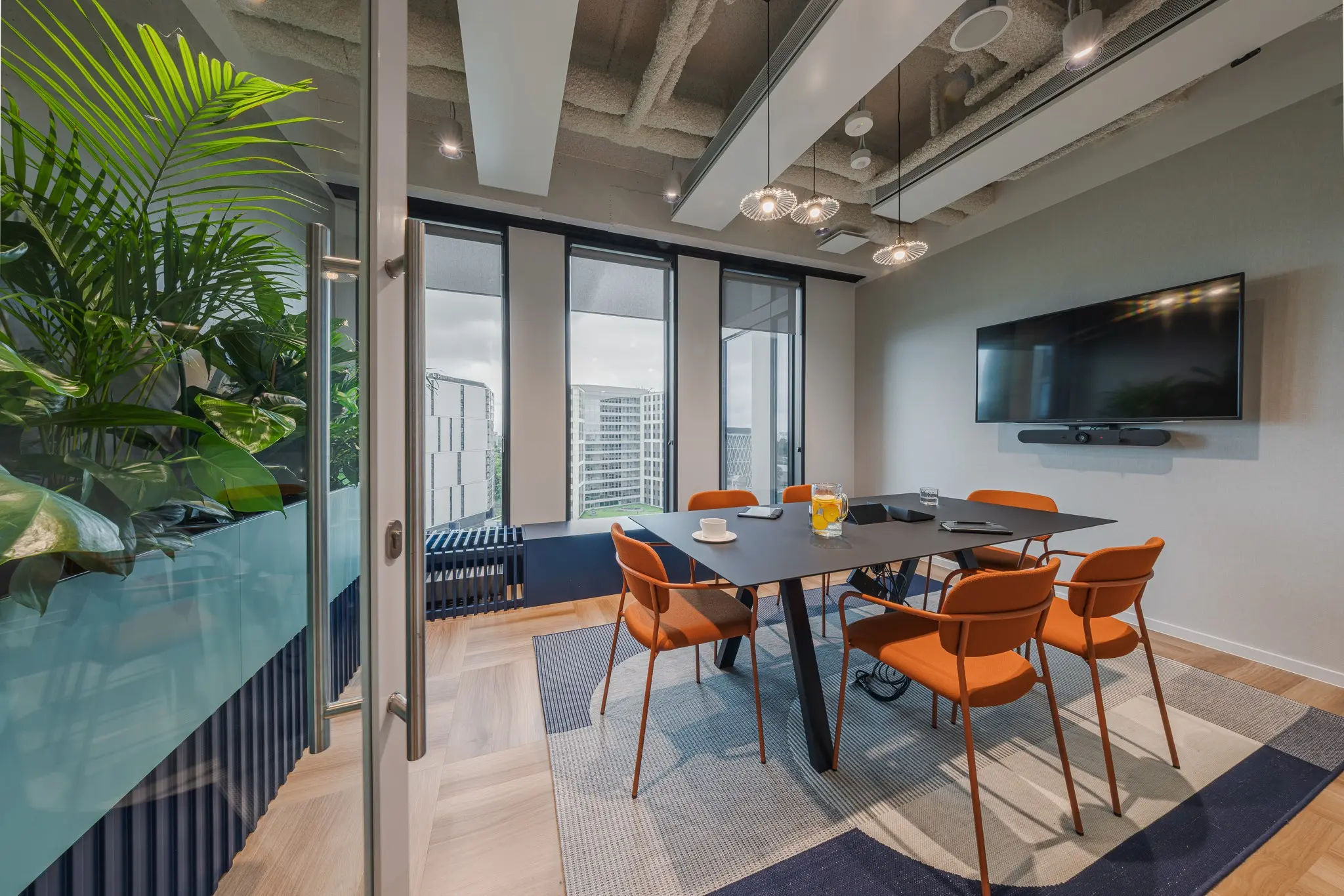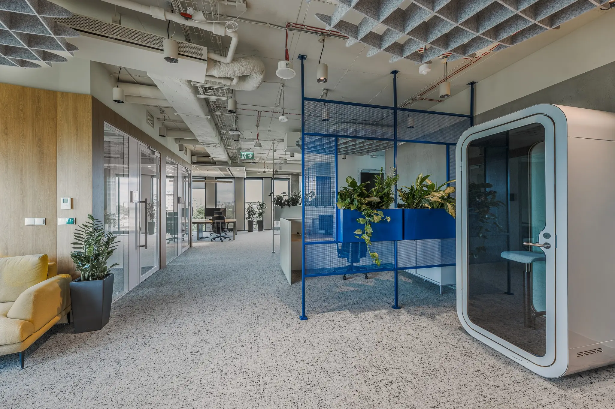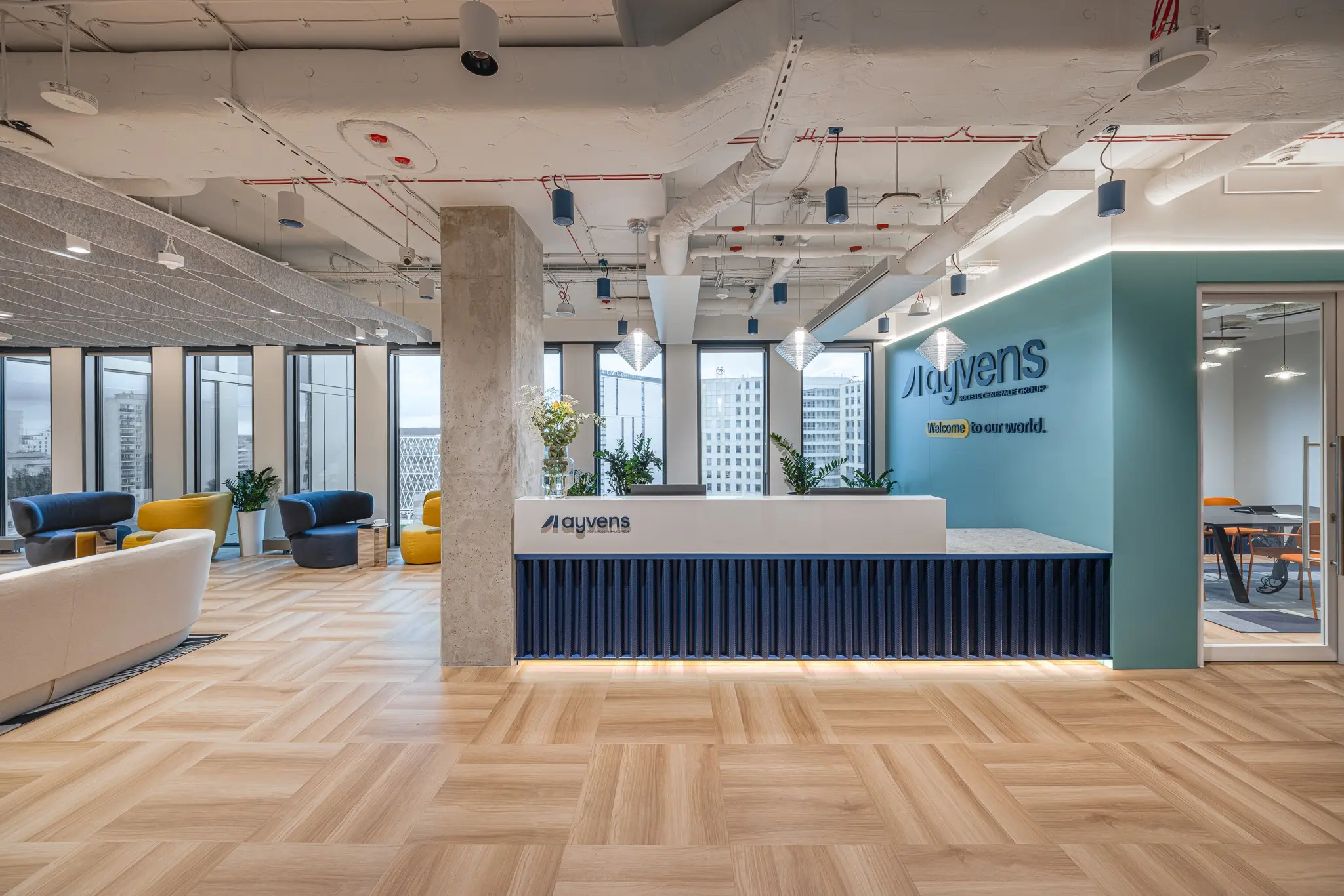 Biuro Ayvens zajmuje ponad 2000 m² na 9. piętrze z panoramicznym widokiem na Mokotów. Zostało zaprojektowane w formule full flex, tak, aby różnorodne funkcje - od stref pracy, przez przestrzenie spotkań, po kuchnię i strefy wspólne - układały się w logiczną całość. Rozplanowanie biura Ayvens to przykład architektury, w której funkcja i forma współgrają z rytmem dnia pracy. Zgodnie z założeniami Klienta, w przestrzeni zrezygnowano z przypisanych stanowisk czy gabinetów, stawiając na otwarty układ.