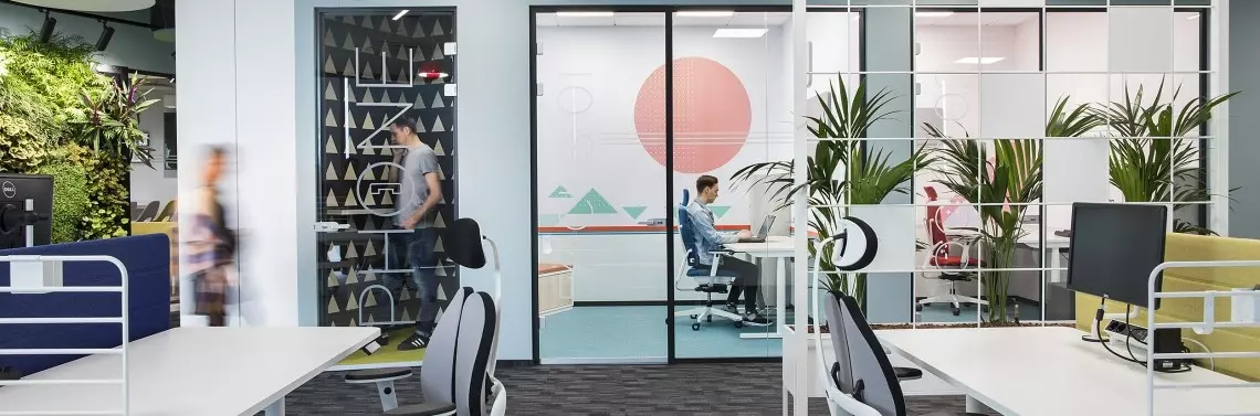 Zacznijmy od odpowiedzi na pytanie: „czym jest przestrzeń typu open space?”. To biuro zaprojektowane na planie otwartym, z pogrupowanymi biurkami, rozmieszczonymi zazwyczaj szeregowo. Możemy rozróżnić małe open space’y (do 9 pracowników), średnie (do 24) i duże (ponad 25). W przestrzeni mogą pojawić się bariery, np. panele biurkowe czy ścianki, ale zawsze są one niższe niż od podłogi po sufit.