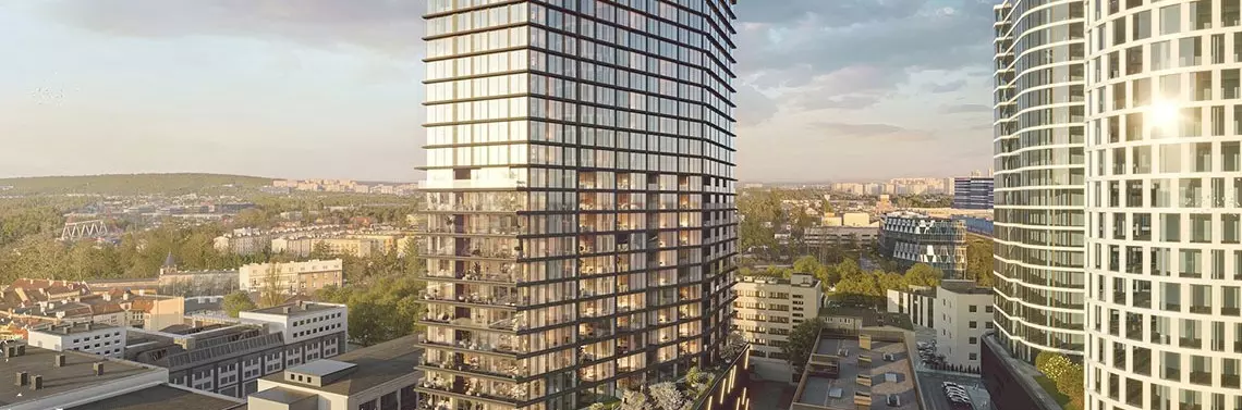 95-metrowy obiekt zaskoczy także swoją niebanalną formą. Połączenie krystalicznej lekkości szkła z ażurowymi ramami elewacji sprawi, że bryła wyróżni się na tle miejskiej architektury. Deweloper zadbał o funkcjonalne układy mieszkań – do 16. piętra włącznie zaplanowano loggie i tarasy, a na wyższych kondygnacjach apartamenty będą w całości przeszklone. O wysokim standardzie wykończenia świadczy m.in. aluminiowa stolarka okienna. Wybrane lokale będzie można łączyć lub dzielić, aby jak najlepiej dopasować je do indywidualnych potrzeb.