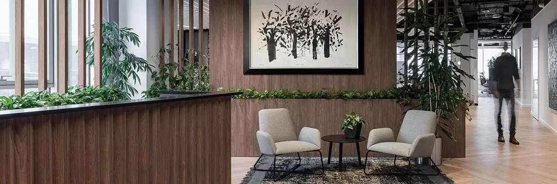 Aranżacja całego wnętrza biura utrzymana w domowym i ciepłym klimacie. W strefie front of house, która wita gości zaraz po wejściu, znajdziemy dużo drewna, otwartej przestrzeni i neutralnych kolorów.