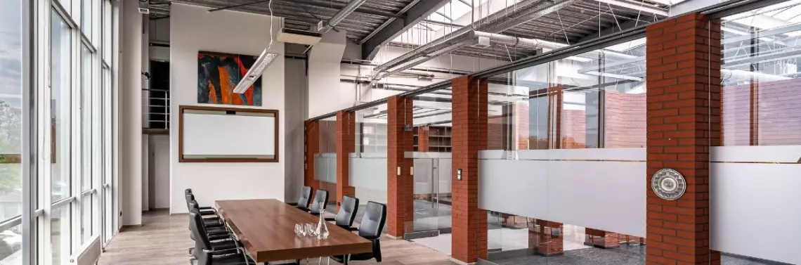 - Sala konferencyjna, do której wpada światło przez okna od podłogi, aż po sam sufit,